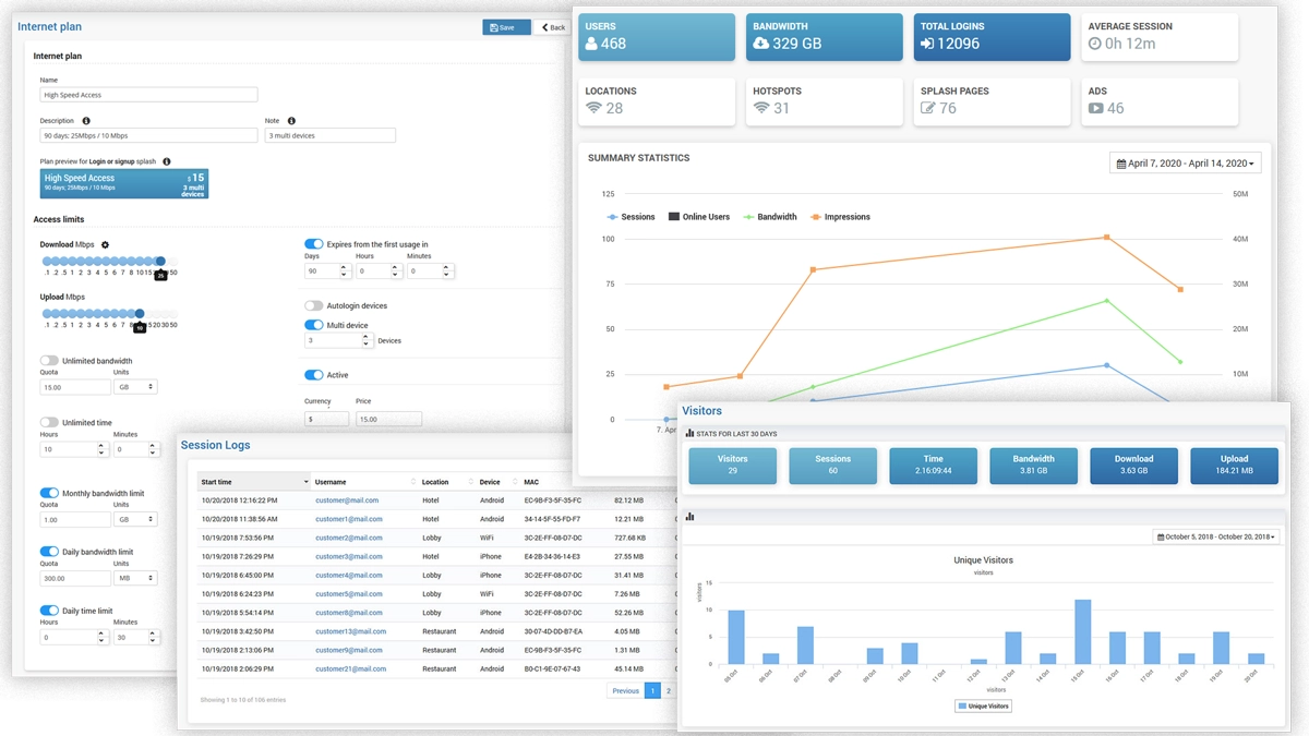Connect routers, customize splash pages, limit user Internet access, engage social WiFi users, accept credit card payments, check statistics and analytic.