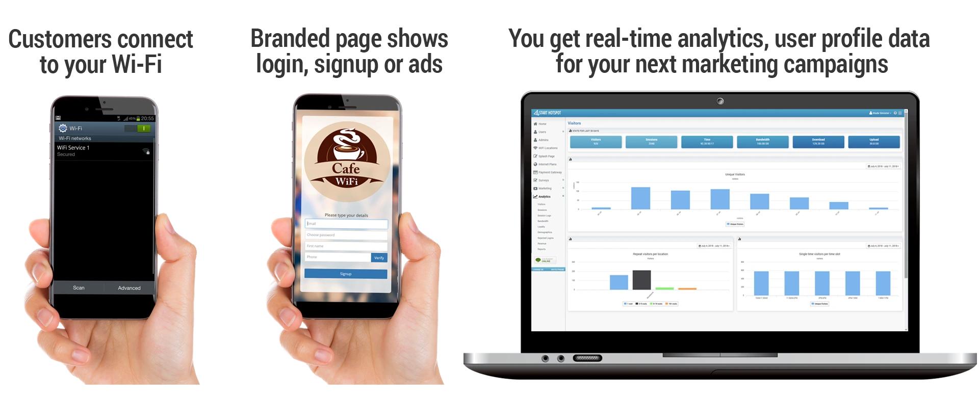 There is a possibility to include various features: free Internet, faster paid Internet, email and customer data collection, the access granted on entering room number and name, the access via social network accounts or having seen video commercials.
