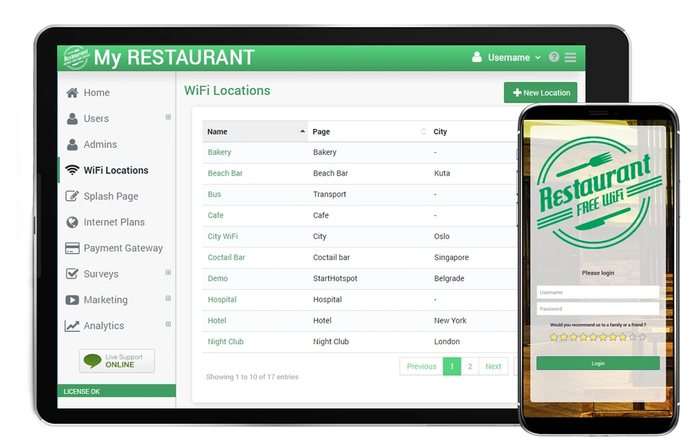 Our Start Hotspot Cloud WiFi system takes care of the AP management, user logins, time and bandwidth limits, daily usage limits, and further enhance user experience with video ads, surveys, and more. Start controlling your Guest WiFi network. It’s that easy!