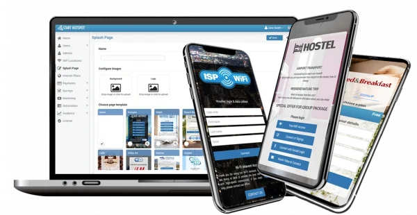 Create Free or paid WiFi with vouchers, social, OTP, card payments, PMS, video ads.