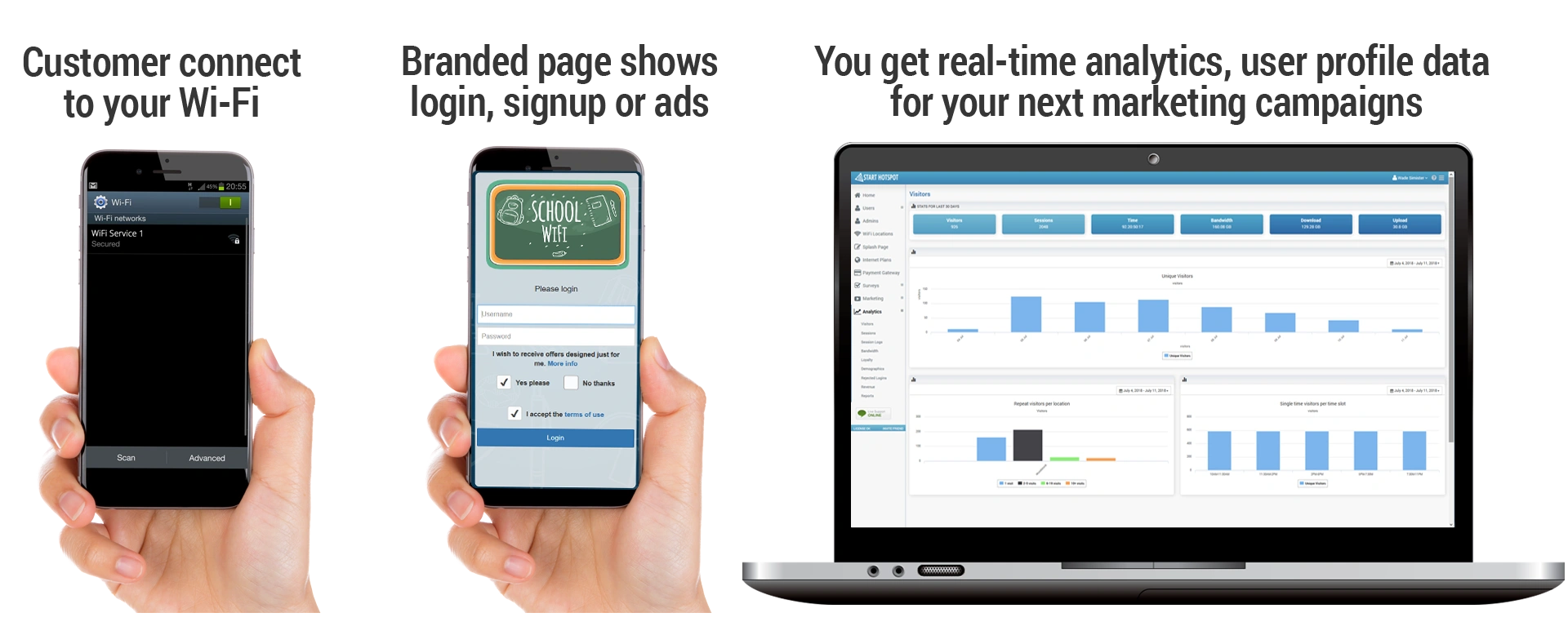 Start Hotspot Education WiFi software will control the session duration, speed and bandwidth, and optionally collect your students e-mail, name, address, for your safety and info marketing activity.
