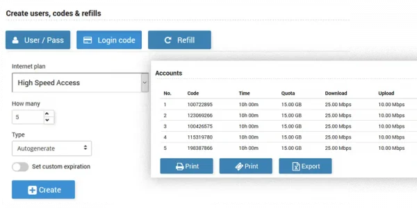Create vouchers and refills in advance with desired price plan limitations (time, bandwidth quota, download and upload rates), and distribute them or sell by your staff, resellers or through your channel partners.