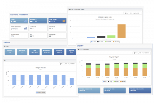 Visitor stats are split into multiple reports, which include loyalty, top users, timeslots, repeating and first time visitors, gender and age breakdowns.